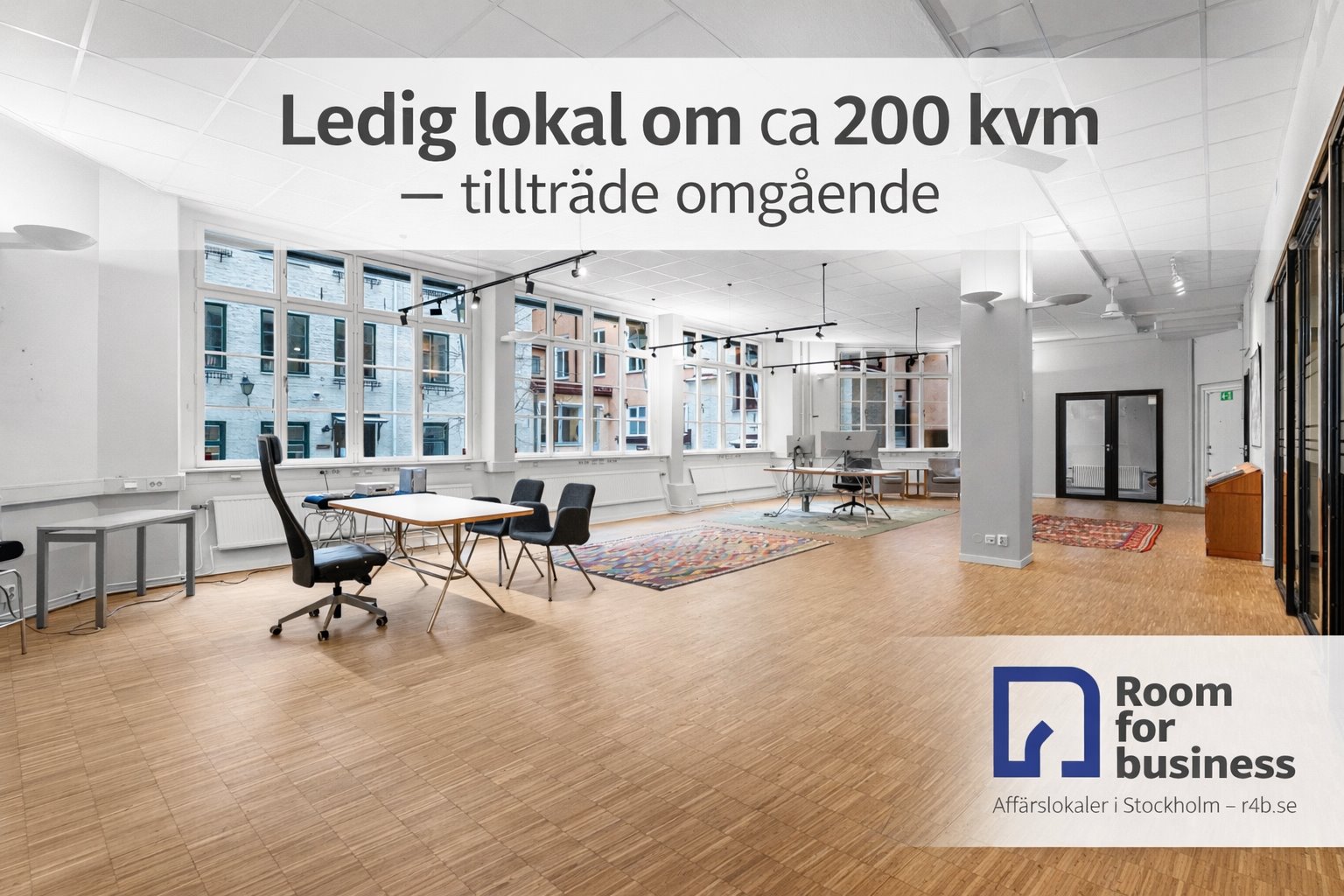 Ljus och flexibel kontorslokal om ca 200 kvm med stora fönster, bra planlösning och omgående tillträde.