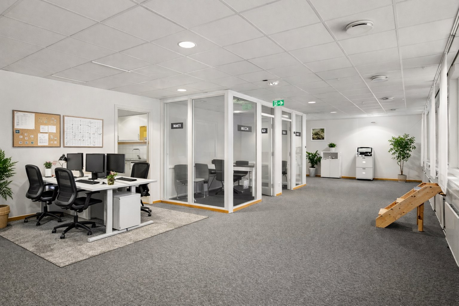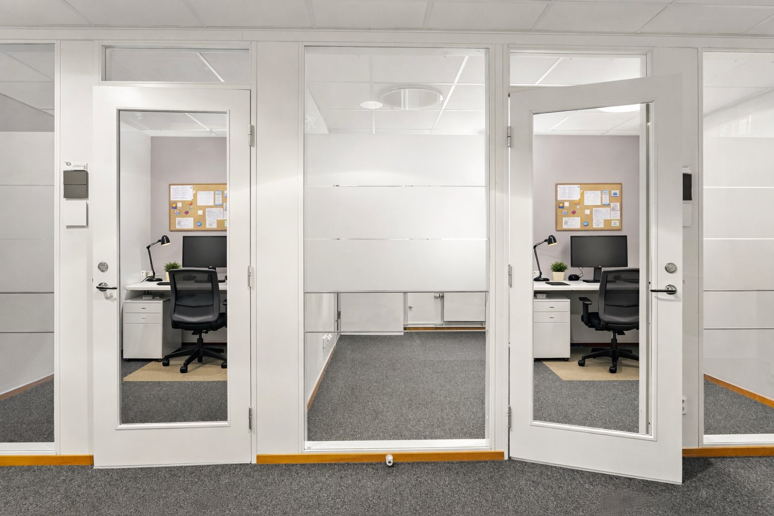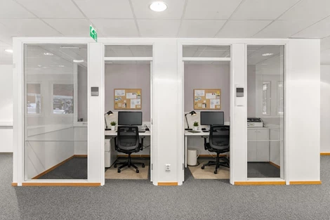 De glasade rummen bidrar till en transparent och luftig känsla samtidigt som de ger möjlighet till avskildhet för fokusarbete eller möten. De öppna ytorna lämpar sig perfekt för teamarbete och kan enkelt anpassas efter verksamhetens behov.