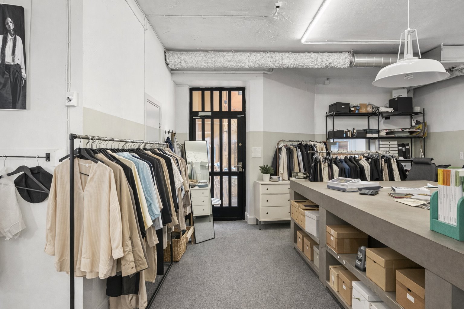 Den generösa ytan rymmer både showroom, arbetsplatser och sociala ytor, vilket gör lokalen idealisk för företag som vill kombinera försäljning med kontor eller studio. De bevarade detaljerna från byggåret 1910 ger lokalen en unik karaktär och en inspirerande atmosfär.