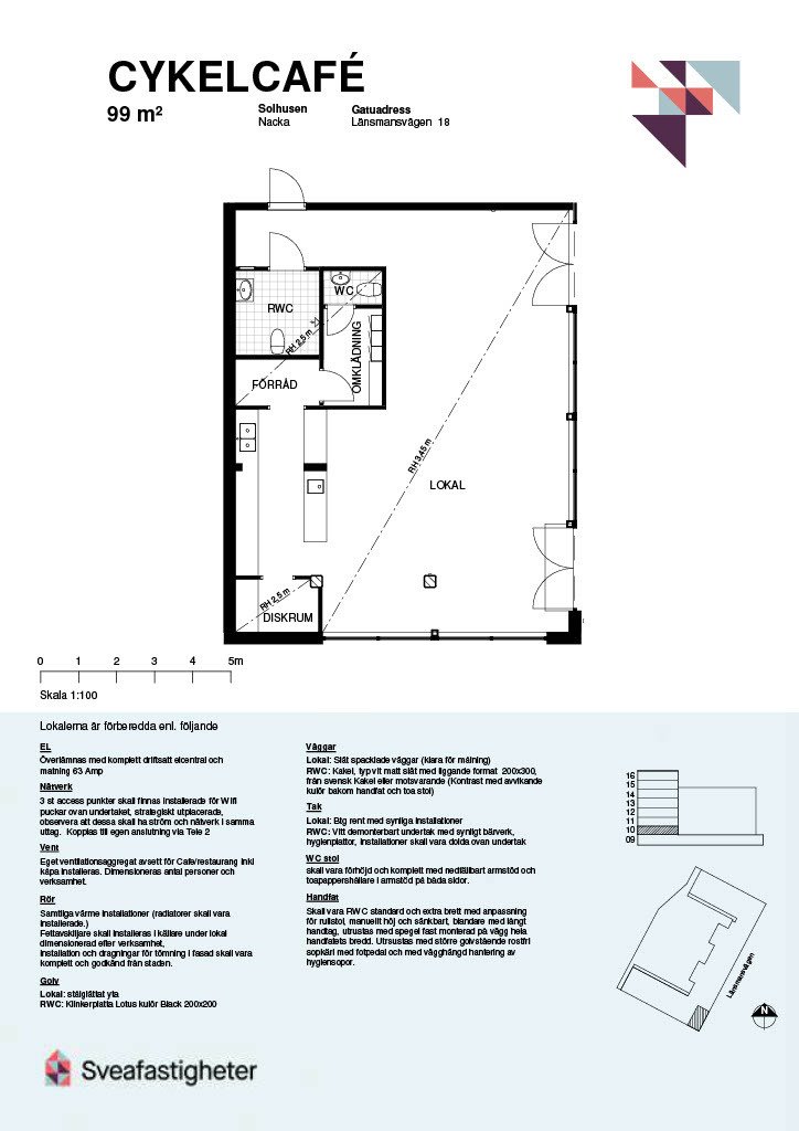 Lokalen är tekniskt väl förberedd och max dimensionerad för upp till 50 personer, med ventilations aggregat om 400 l/s, 63A elskåp, installerad fett avskiljare samt eget soprum till lokalen.
